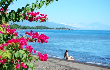 The North coast of Bali enjoys generally calm seas with gentle sloping beaches and waters safer for young families. The fine sand is volcanic (black) rather than coral (yellow).